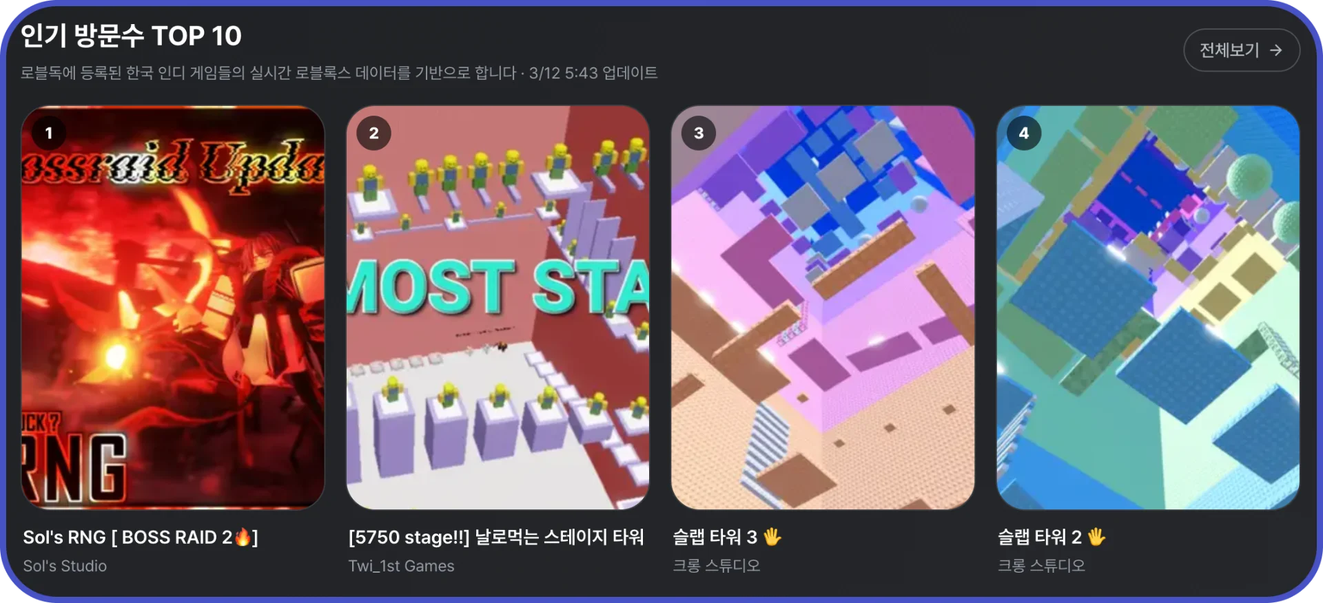 안녕하세요, 로블독(ROBLODOC)입니다.한국 로블록스 인디 게임의 성장을 응원하는 로블독이 오늘, 더욱 정확하고 생생한 정보를 전달하기 위해 실시간 데이터 연동 시스템과 상세 ...
